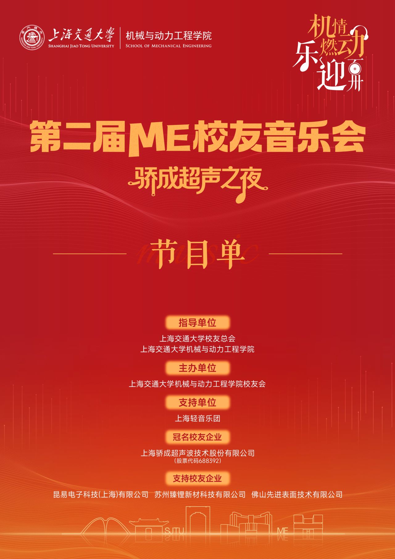 机情燃动,乐迎百卅。上海交通大学第二届机械与动力工程学院校友音乐会将于11月15日19:00在徐汇校区文治堂举行。作为扎根交大沃土成长起来的校友企业,j9九游会超声(股票代码:688392)有幸冠名本次盛会,与万千校友共赴这场 “声” “乐” 的交响,共庆母校百卅盛事。